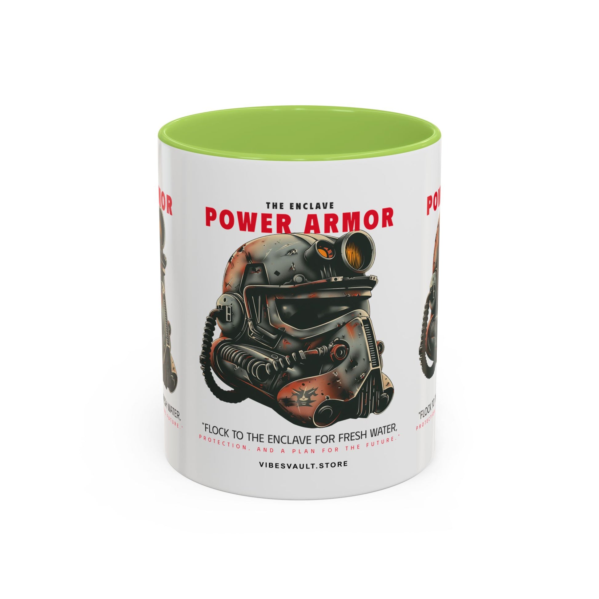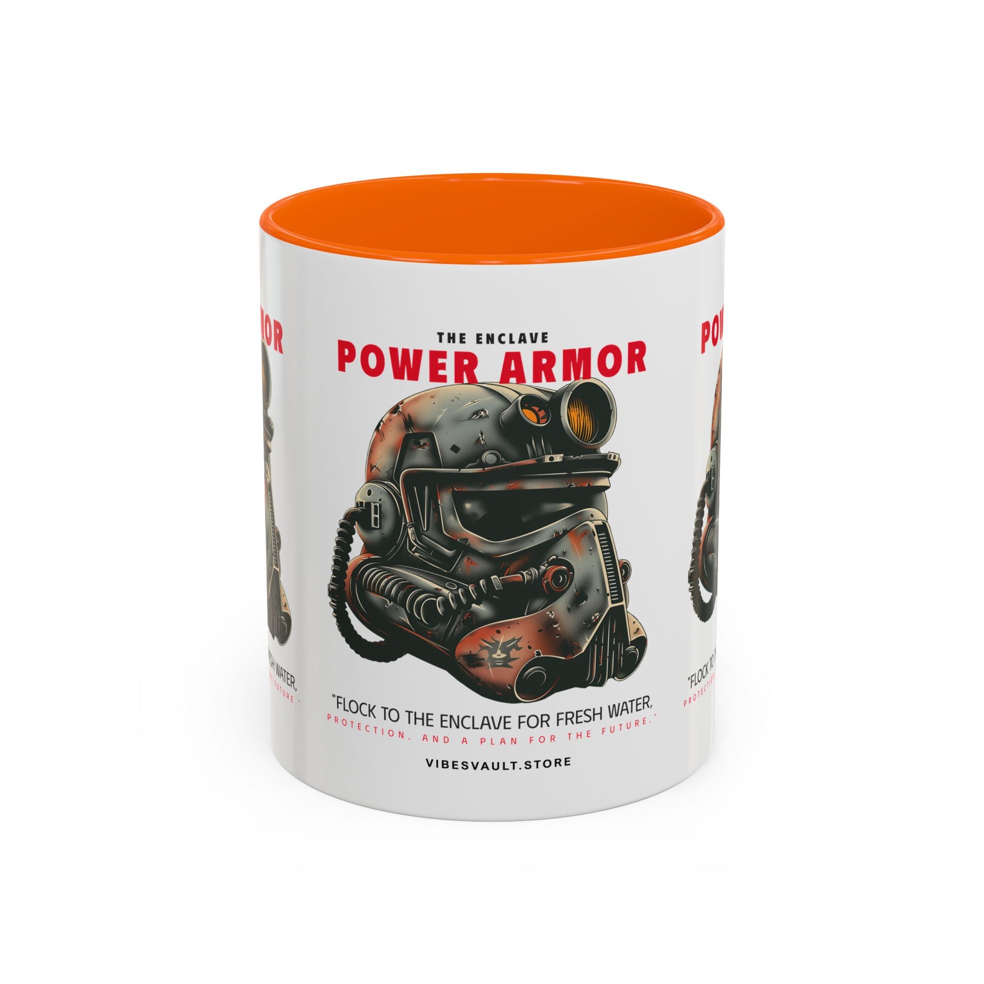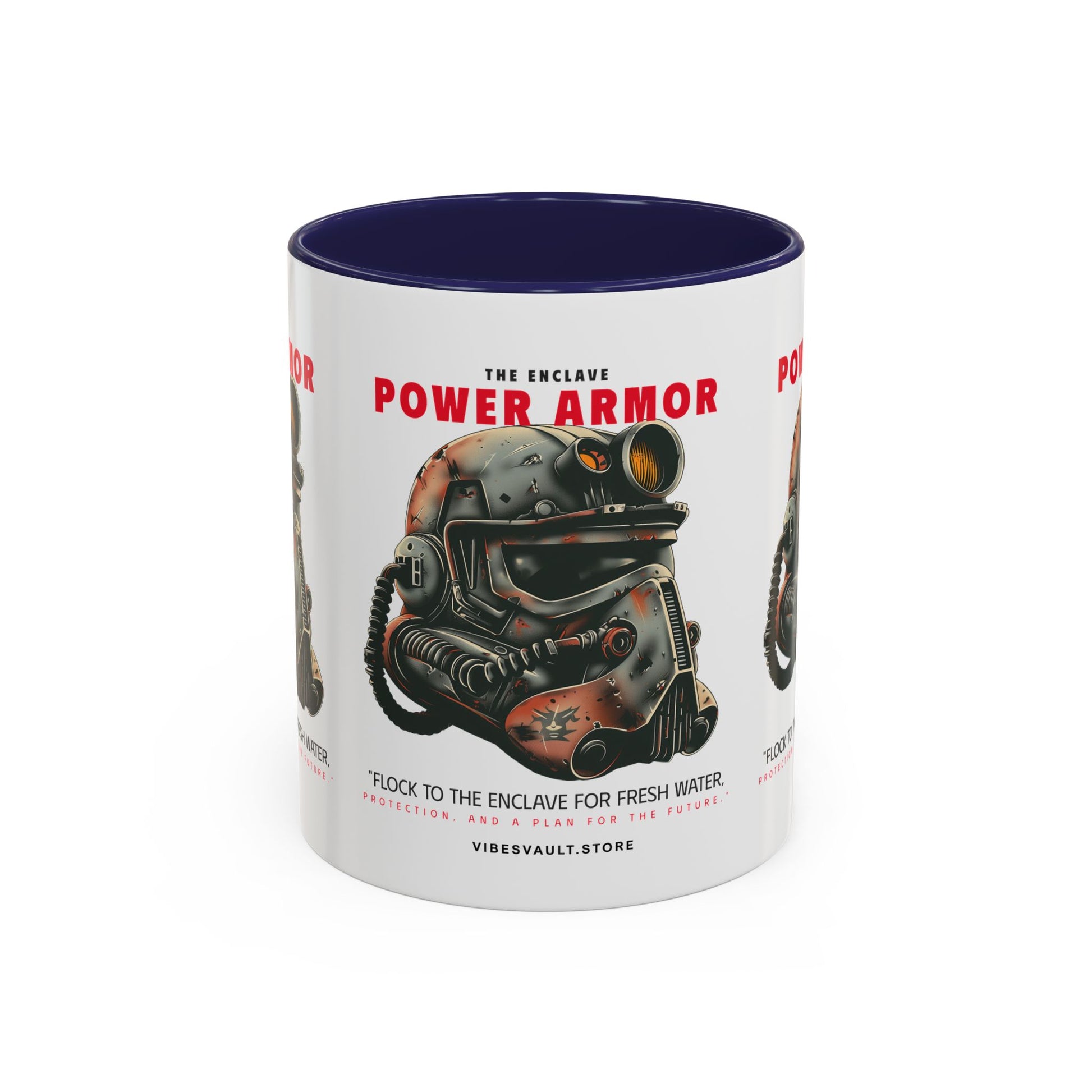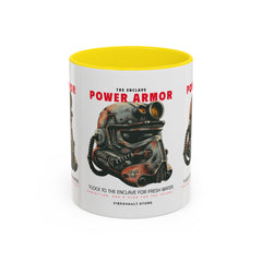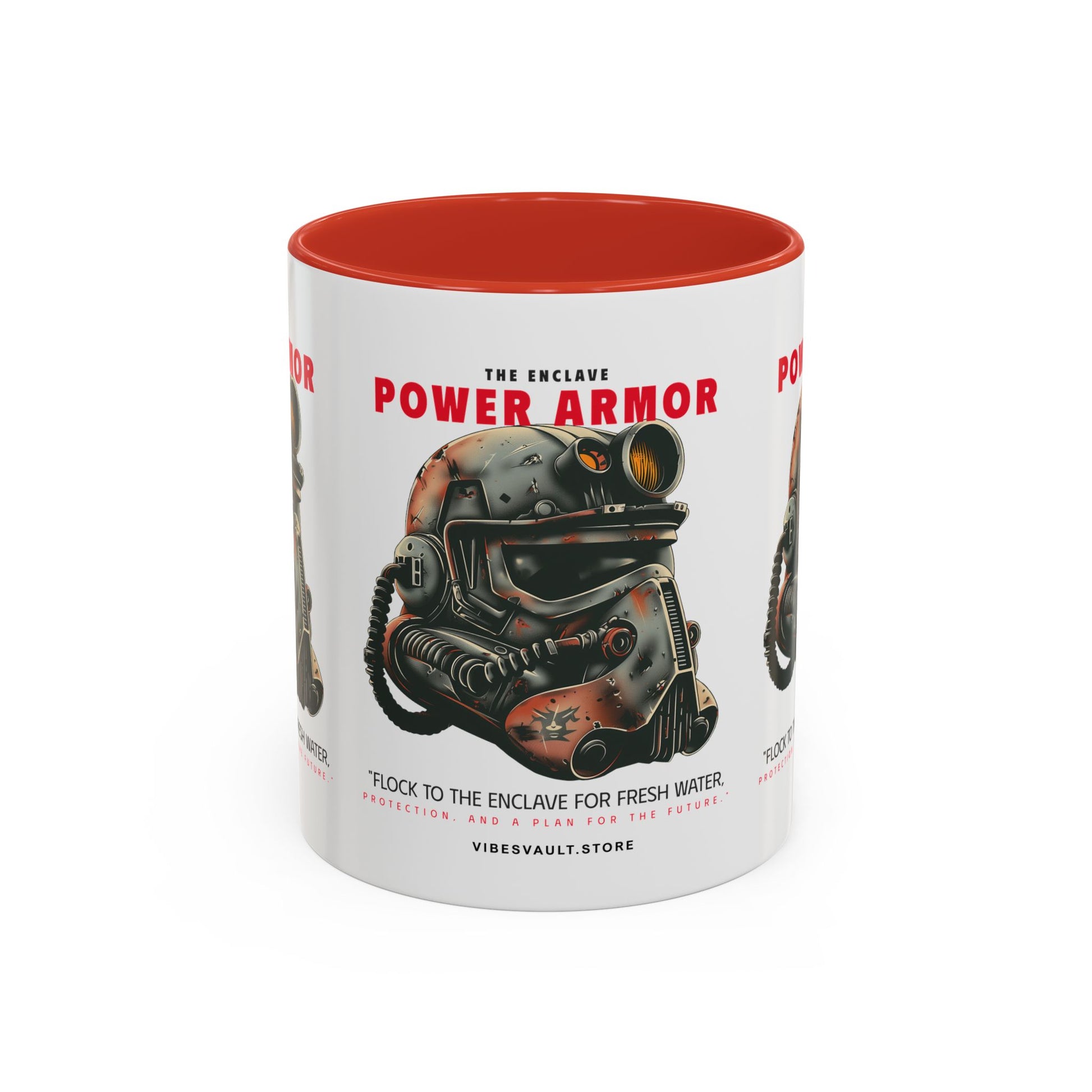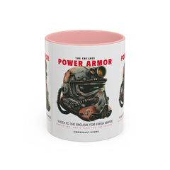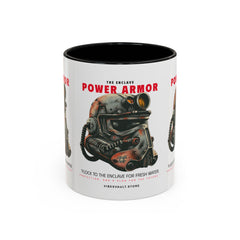 This ceramic accent mug brings a gritty, retro-futuristic edge to everyday coffee and tea rituals. The artwork centers on a weathered power armor helmet—industrial textures, worn paint, and brass highlights—framed by bold red lettering. It feels like a found relic from a post-apocalyptic radio ad or a collector’s cabinet, the kind of piece that sparks conversation on slow mornings or late-night game sessions. The colored interior and handle add a punch of contrast, making the illustration pop and giving the mug personality on the shelf. Use it while sketching worldbuilding ideas, loading up on caffeine before a marathon session, or simply as a statement piece in a fan’s mug rotation. The sturdy ceramic, glossy finish, and vibrant print hold up to daily use and dishwashers, so the story stays vivid sip after sip.