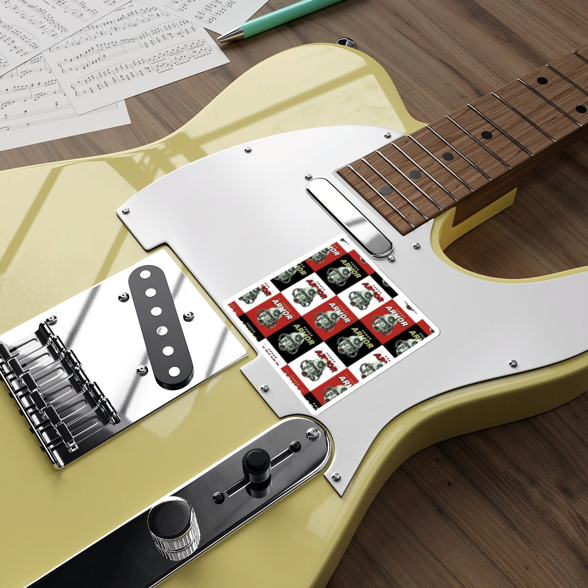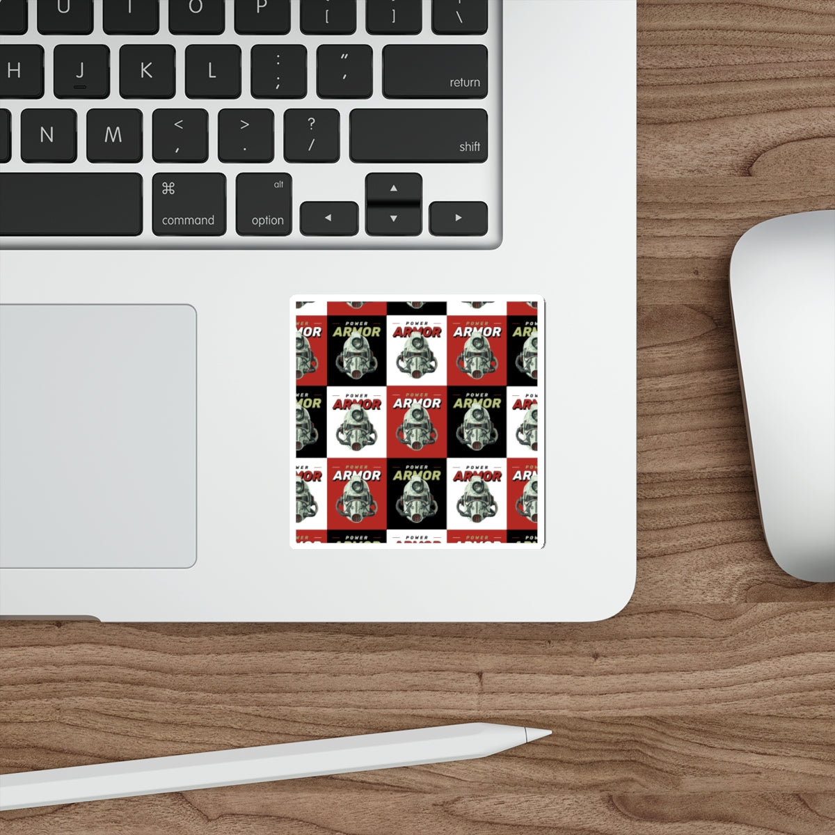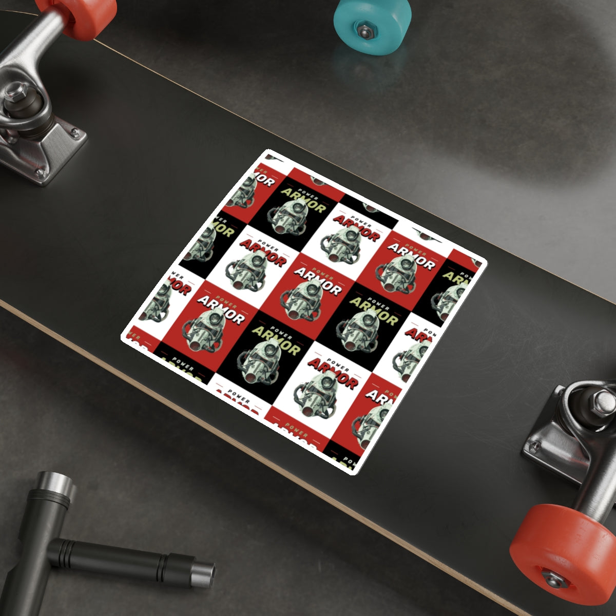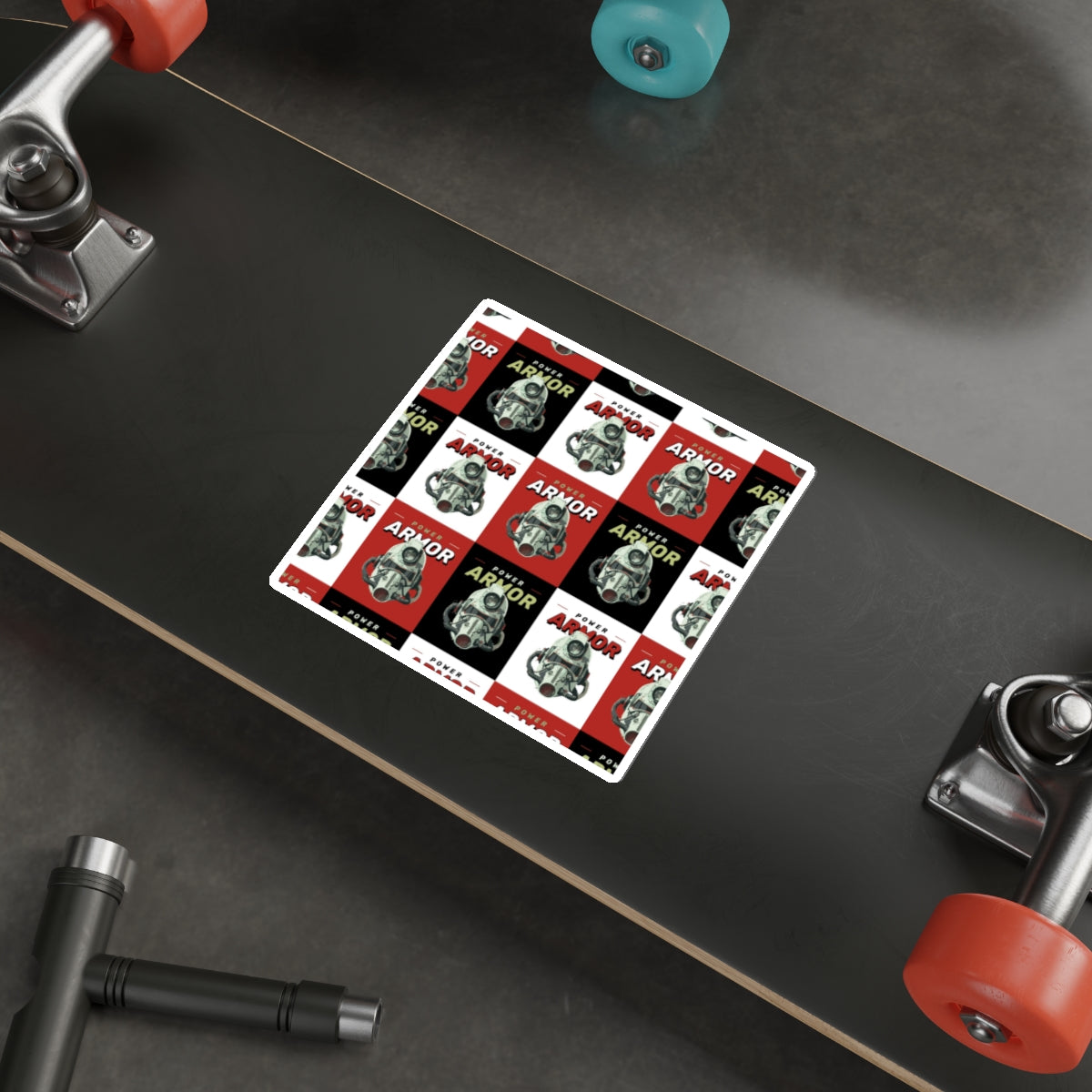 A sheet of matte die-cut vinyl stickers featuring a bold, retro-inspired repeating design of a vintage armored helmet and the words “Power Armor” in alternating red, black, and white blocks. Each sticker has a smooth matte surface and a subtle weathered look that reads like a miniature vintage poster. Weather-resistant and laminated for UV protection, these stickers hold up outdoors without losing their muted, nostalgic tones. Peel-and-stick backing makes application easy on flat, smooth surfaces like laptops, water bottles, notebooks, and instrument cases. The composition and compact scale lend themselves to layering with other stickers or using as a repeating motif on gear and personal items.