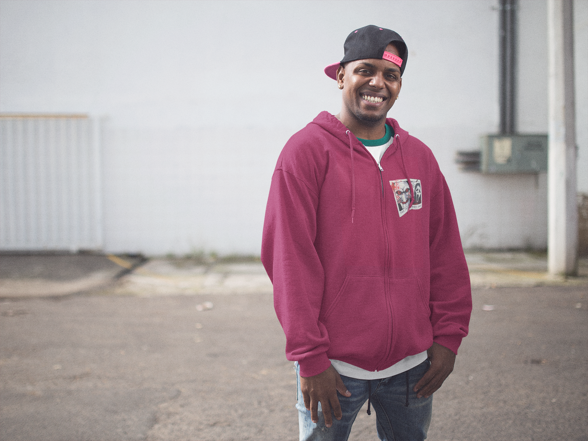 Stay cozy and stylish this Halloween with our Red Zip-Up Hoodie! This small adult hoodie showcases iconic graphics: one featuring the chilling mask of Jigsaw from SAW and another of the notorious mask and knife from the Scream movies, making it a perfect choice for horror fans!