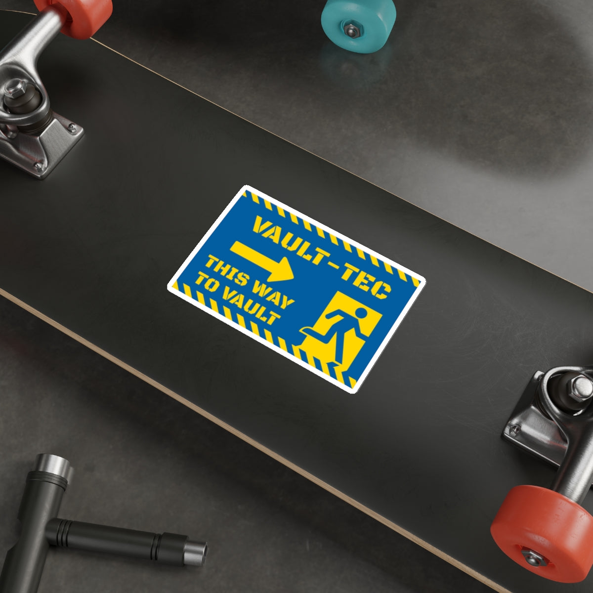 Bright, retro-gaming vibes in a small, weather-ready sticker. This matte, die-cut vinyl decal echoes classic post-apocalyptic signage with bold yellow typography and an arrow motif on a deep blue field — a playful nod to bunker-bound lore that clips easily to laptops, water bottles, notebooks, or toolboxes. The low-gloss finish cuts glare while the UV laminate and water-resistant material keep colors vivid outdoors. It sticks on smooth surfaces and peels away without fuss, so you can swap it between gear as your mood (or mission) changes.